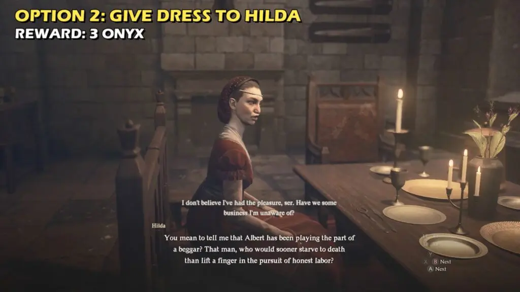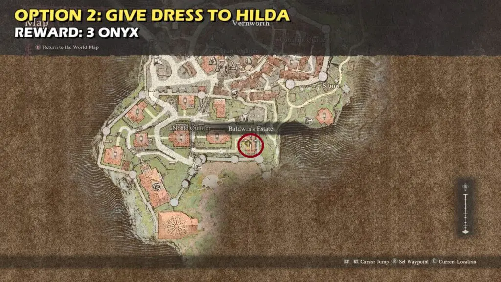 Give the garb to Albert’s wife (Hilda) at Baldwin’s Estate. Return to her in a few days, and she will tell you that Albert has transformed and started to work regularly. You will receive a reward of onyx x2.