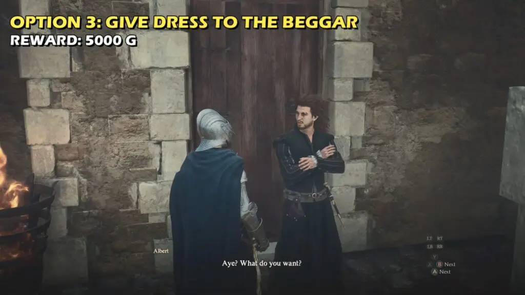 Return the garb to Albert (beggar) to get 5000 gold as a reward.