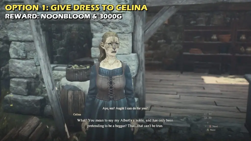Give Celina the clothes at the traven in the slum during nighttime, but she will not be happy. The next day, you return to the same house to find Celina has killed both Albert and herself. You will receive 3000 gold and a Noonbloom to end the mission.