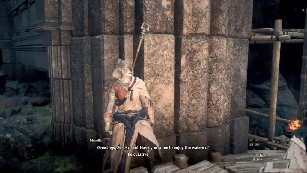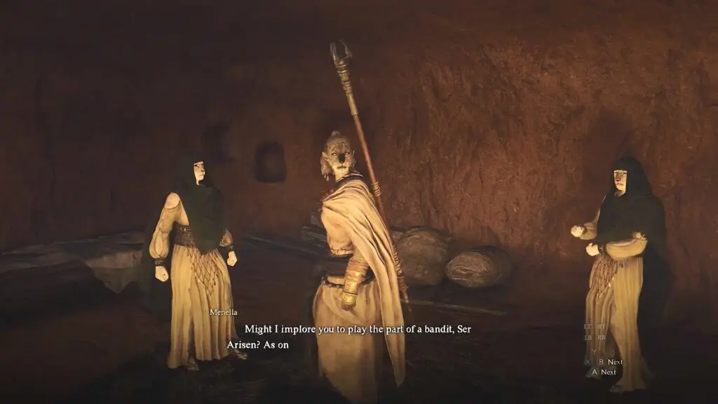 Speak with Menella again when you are ready to continue. At night another NPC arrives outside. Speak with the NPC and then bring him inside.