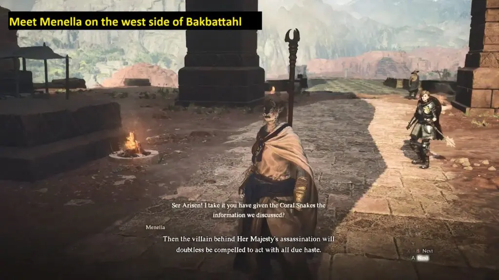 After leaking the information, follow the game marker and you should meet Ser Menella on the west side of Bakbattahl.