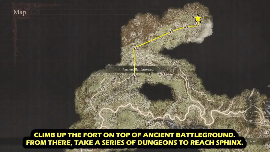 This quest can be started in Mountain Shrine. For this travel north of the Checkpoint Border Town until you reach the Ancient Battleground. Continue north to Worldsend Cavern, then along Shrine Corridor to reach Mountain Shrine. Climb the stairs to find the Sphinx at the top.