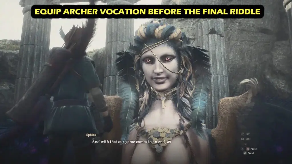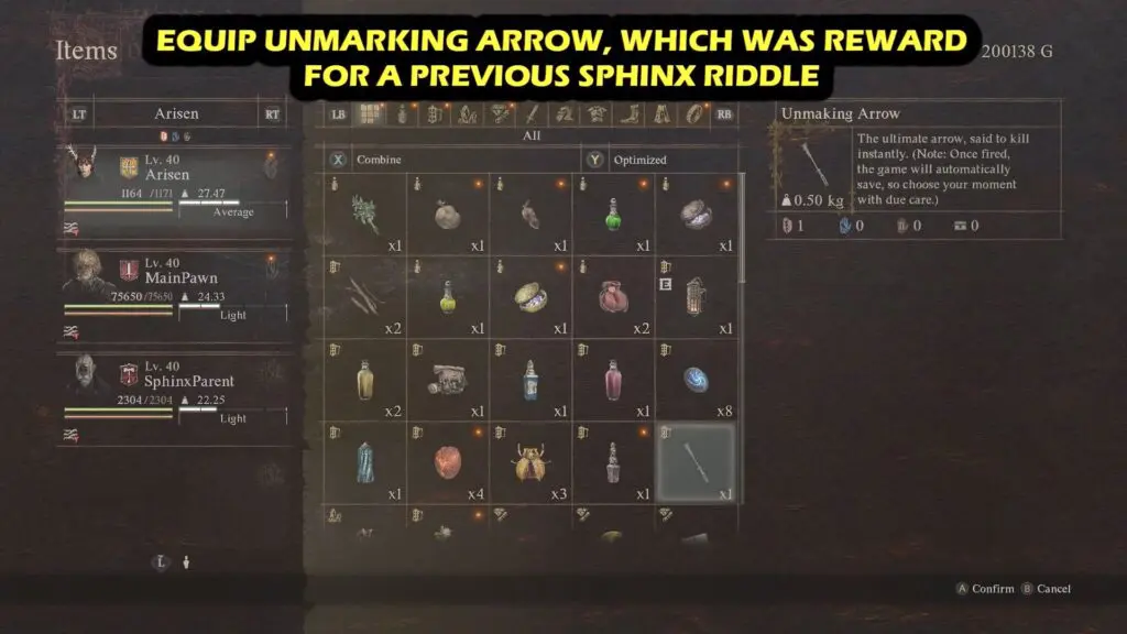 After you’ve solved all of the riddles, first equip Archer Vocation and equip Unmaking Arrow.
