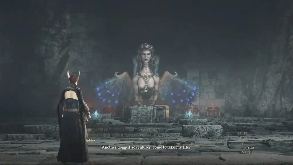 Talk to the Sphinx, and she’ll attempt to fly away. Quickly attack her to start the boss fight. To kill her, equip the Unmaking Arrow from your inventory and shoot her in the leg. You must kill her in order to obtain the key she drops (Key of Sagacity); else, she will fly away.