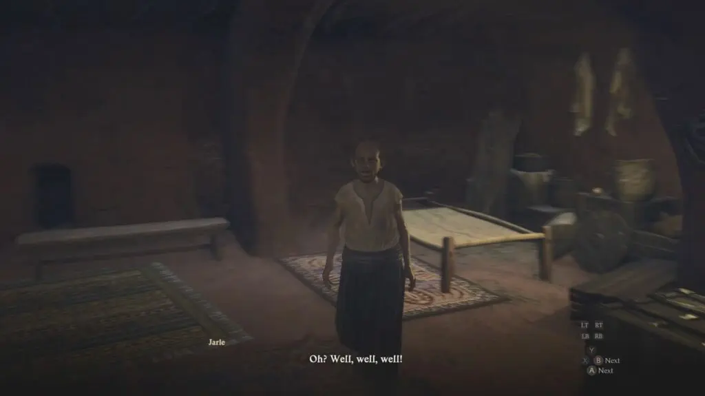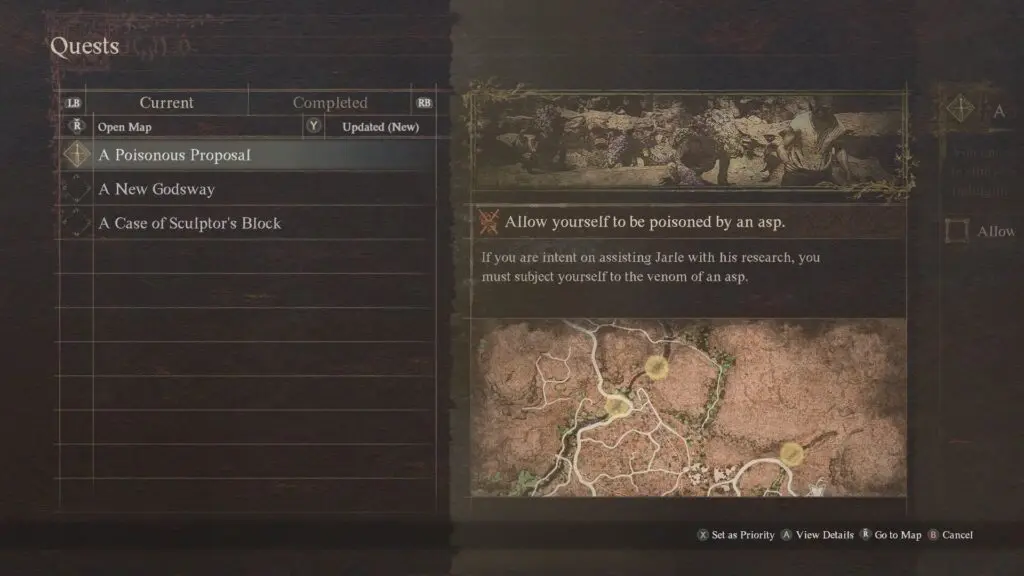 To start the quest, speak with Jarle inside the building directly across from The Rockmouse’s Burrow in Bakbattahl. Refer to the location below. He wants you to get poisoned by an Asp as he wants to study the poison effect on a living species.