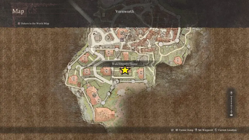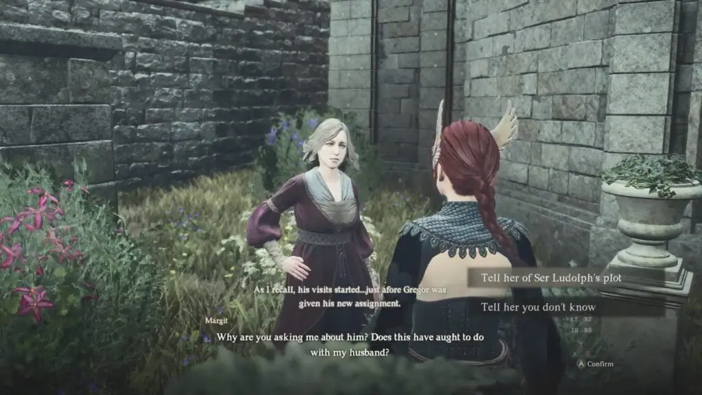 Then speak to Marget (NPC) outside the Watchhead’s home in the Noble Quarter of Vernworth. Choose the dialogue option “Tell her of Ser Ludolph’s plot“. She will ask your help to save her husband Gregor at the Illdoers’ Resting Place.