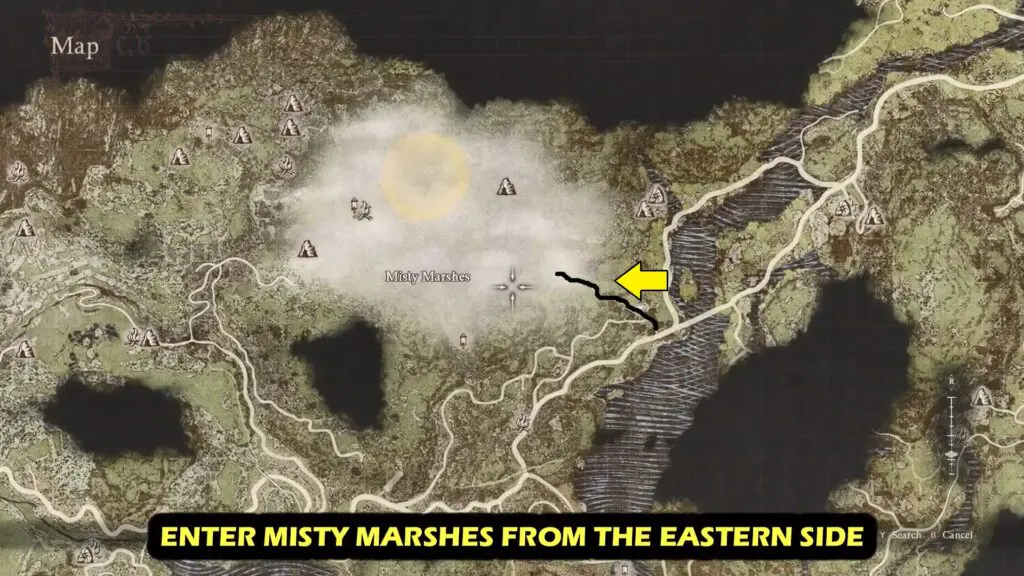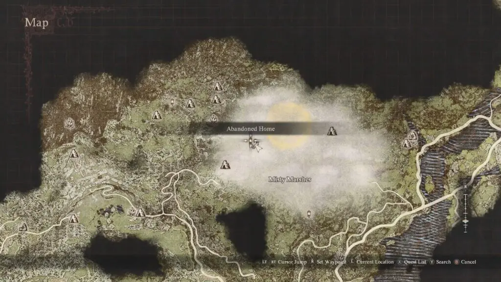 Once you’ve accepted the quest, make your way to the Misty Marshes from the East side. Refer to the map below. Follow the torches and it will lead to the Abandoned house.