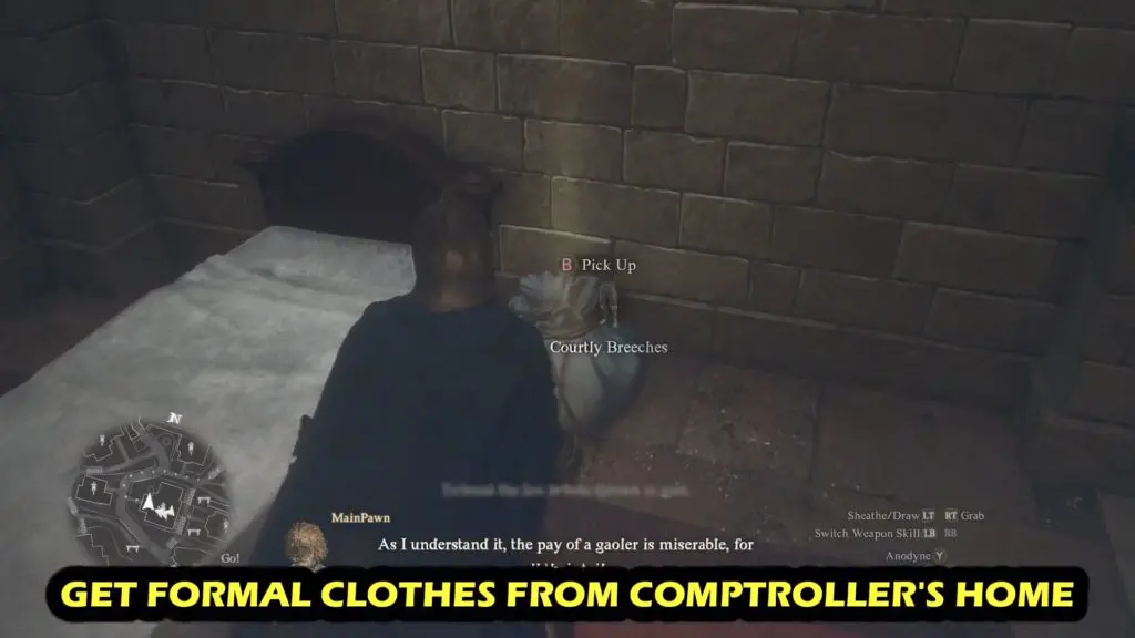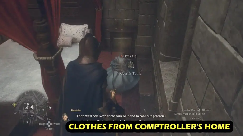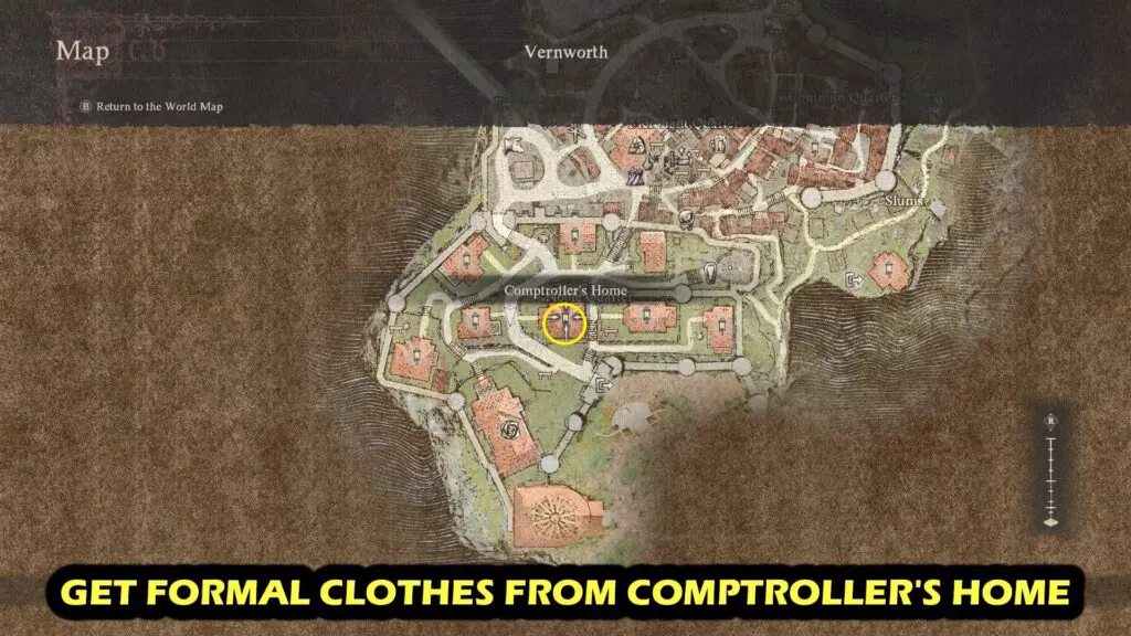 To obtain formal clothes (Courtly Tunic and Courtly Breaches), go to the Comptroller’s Home in Vernworth’s Noble Quarter. Refer to the location below.