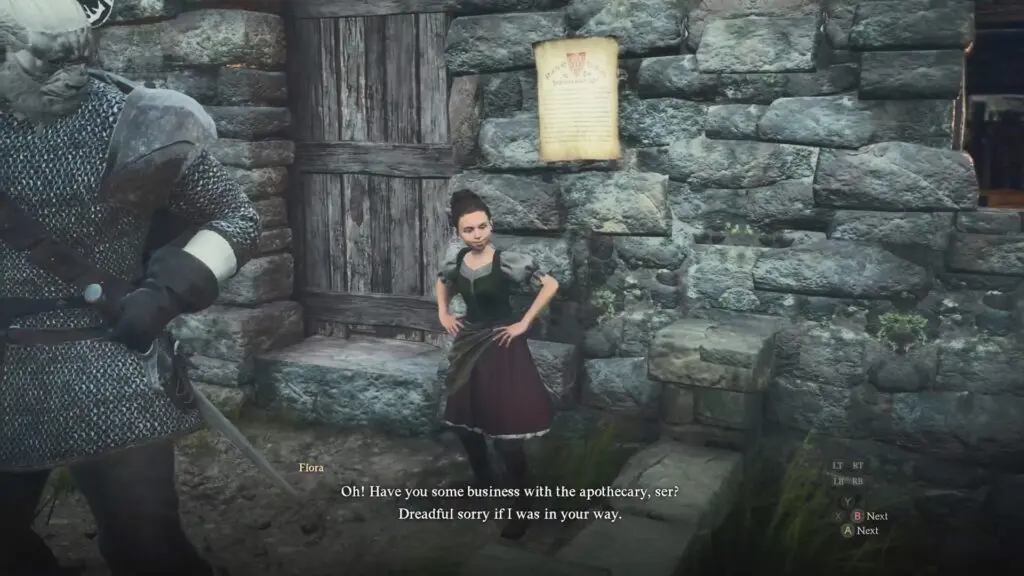 This quest can be initiated during the main quest “Seat of the Sovran“. Speak with a girl named Flora outside Runne’s Apothecary in Melve to start the quest. She needs help in procuring medicine.