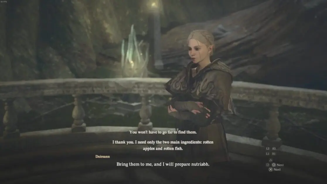 Go back to the “The Arborheart” in Sacred Arbor and speak with an NPC named Doireann. She’ll request the ingredients for the dish: rotten fish and rotten apple.