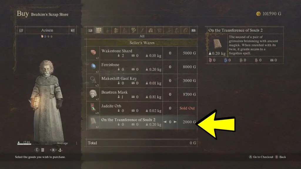 Visit Ibrahim’s Scrap Store at the Checkpoint Rest Town. Buy “On the Transference of Souls 2” for 2000 G.
