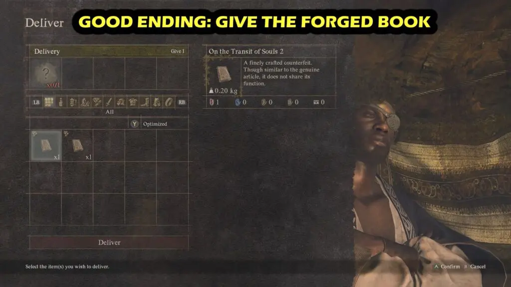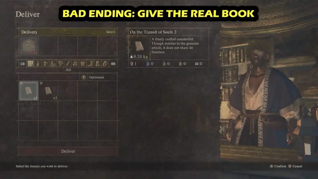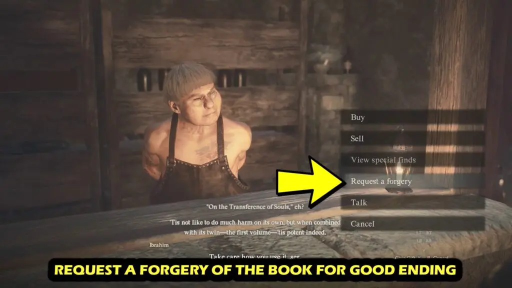 Request a forgery of the book for 2400 G. Wait two days and speak with Ibrahim to acquire a fake book titled “On the Transit of Souls 2”.