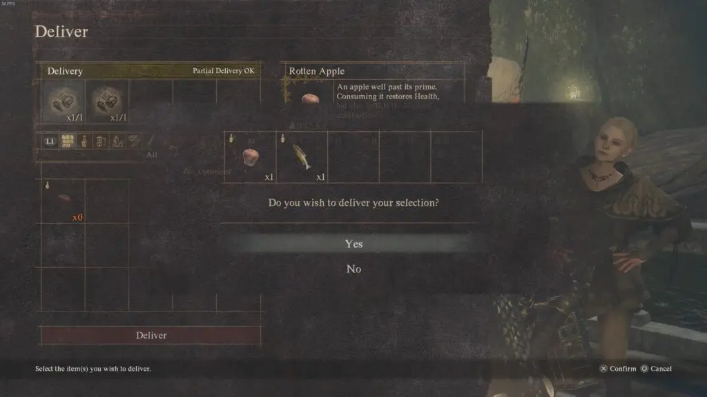 Head back to the elf at the Sacred Arbor, inform her of the meal request from Sara, and she’ll tell you to collect rotten apples and fish.