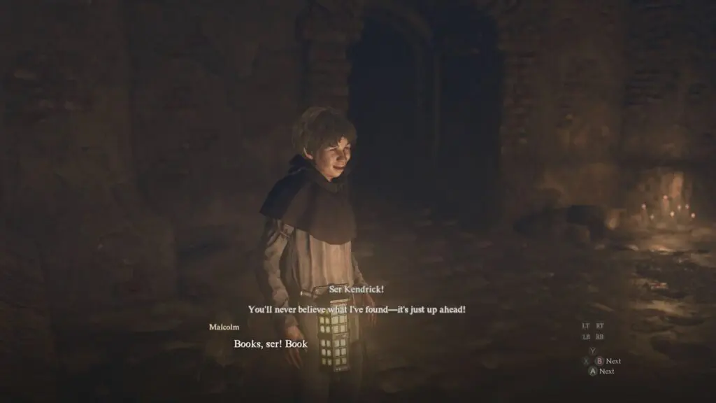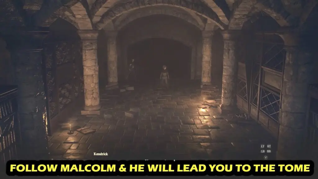 Talk to the kid and then follow him to the “place with plenty of tomes” (underground library)