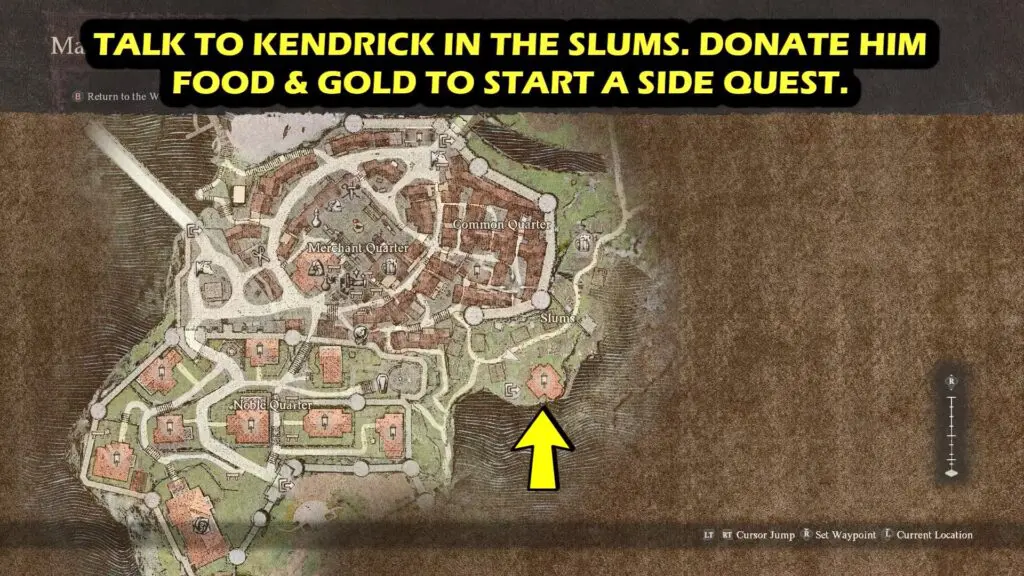 During the main mission “The Caged Magistrate“, go to the slums and talk to Kendrick (NPC). Donate him Food + 1000 Gold to start the side quest “The Hell of History“.
