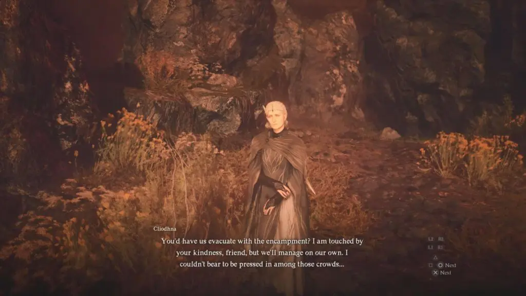 Once you convince them to evacuate, the player should start escorting Gaustafr and Cliodhna to Volcanic Island Camp. Defeat any enemies or monsters on the path.