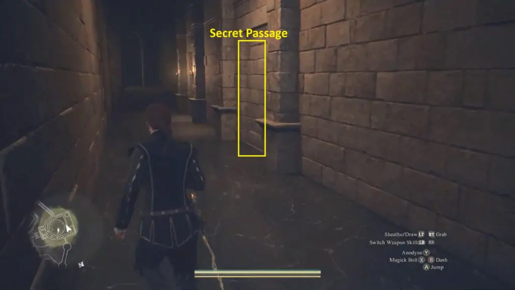 Now you must follow the same path. From the main entrance, enter the same hallway and go along the wall until you reach a plain wall between two storage rooms. As you approach the wall, the secret entrance will automatically open.