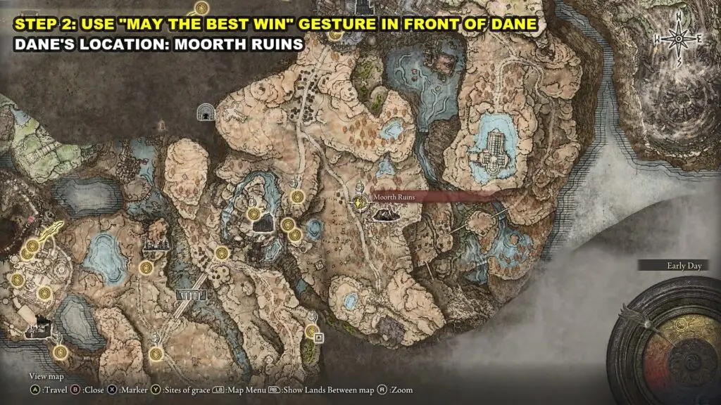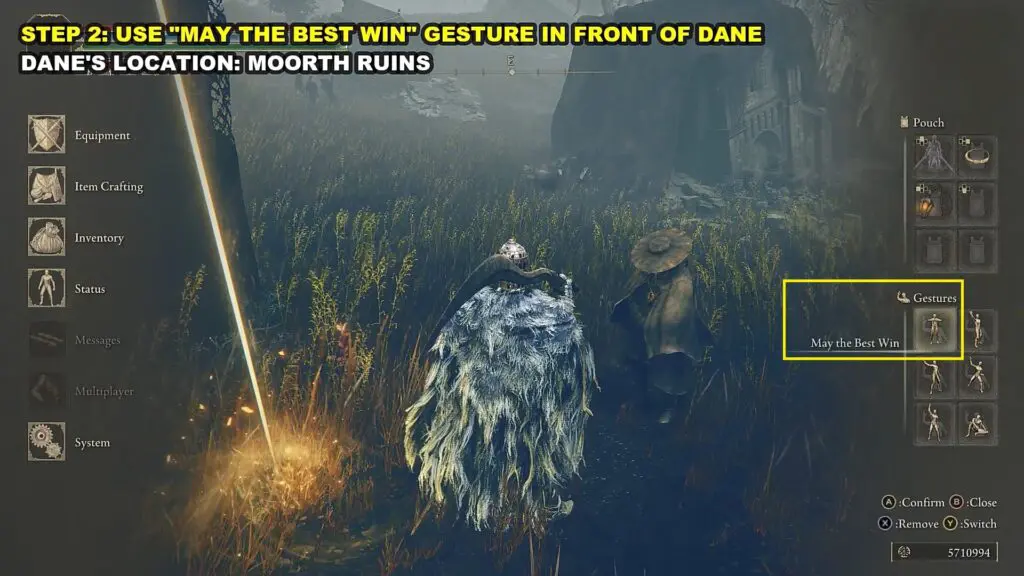 Dane is near the Moorth Ruins Lost Grace. Stand in front of him and use the “May the Best Win” Gesture as shown in the pictures below. This will initiate a fight with Dane. Defeat Dane in the fight.