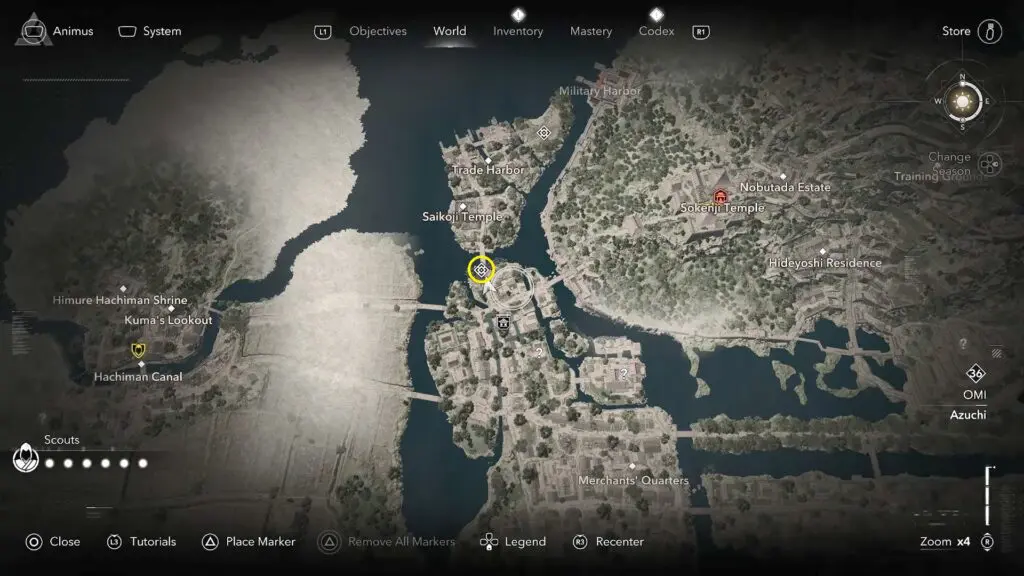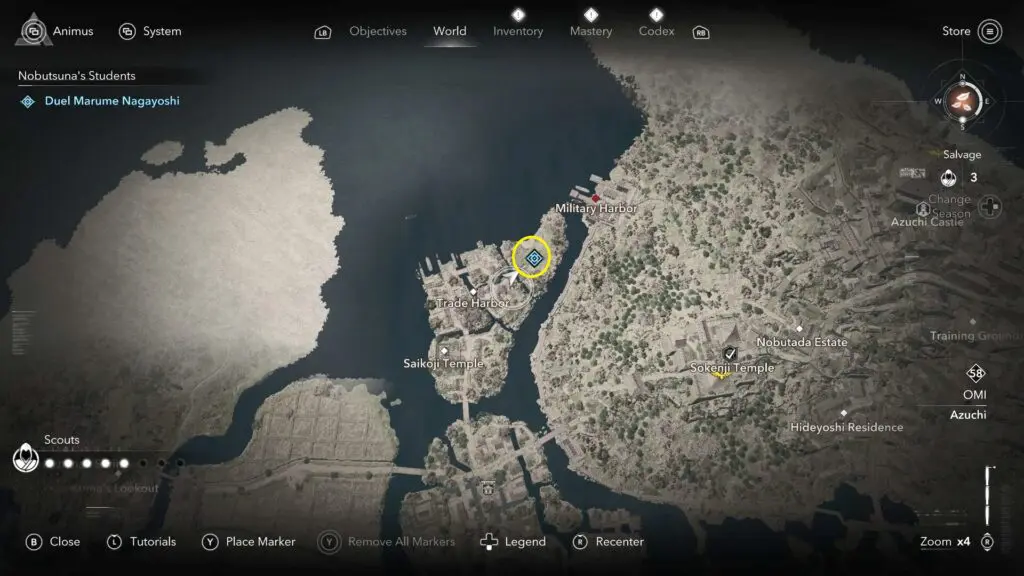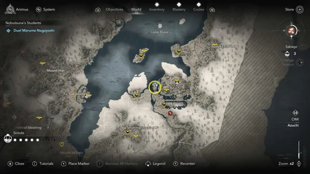 After that, you’ll need to travel to the very tip of the island in the northwest corner of Azuchi. Marume Nagayoshi is located west of Azuchi Castle in the Azuchi area of the OMI region. Refer to the image below.