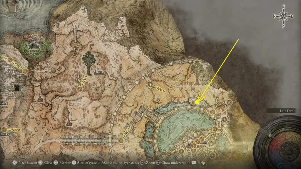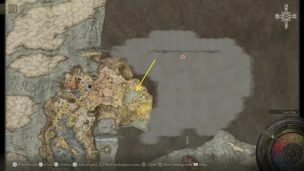 Go northeast of Leyndell at the location marked in the pictures below. Wait for some time at the highlighted location and you will be invaded by Dung Eater. Defeat him and you will get the Sword of Milos.