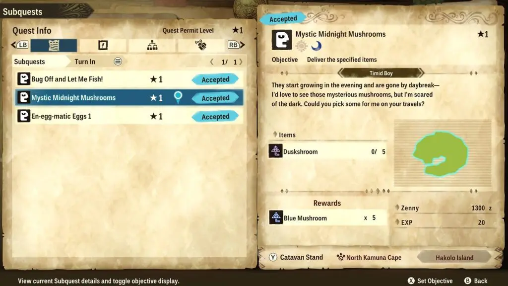 You get the ‘Mystic Midnight Mushrooms’ subquest by talking to the Timid Boy at the eastern portion of the map at the location as shown in the picture below. You will be tasked to bring five Duskshrroms that could be found only during the evening in North Kamuna Cape. Check the video at the bottom of the page for a video walkthrough.