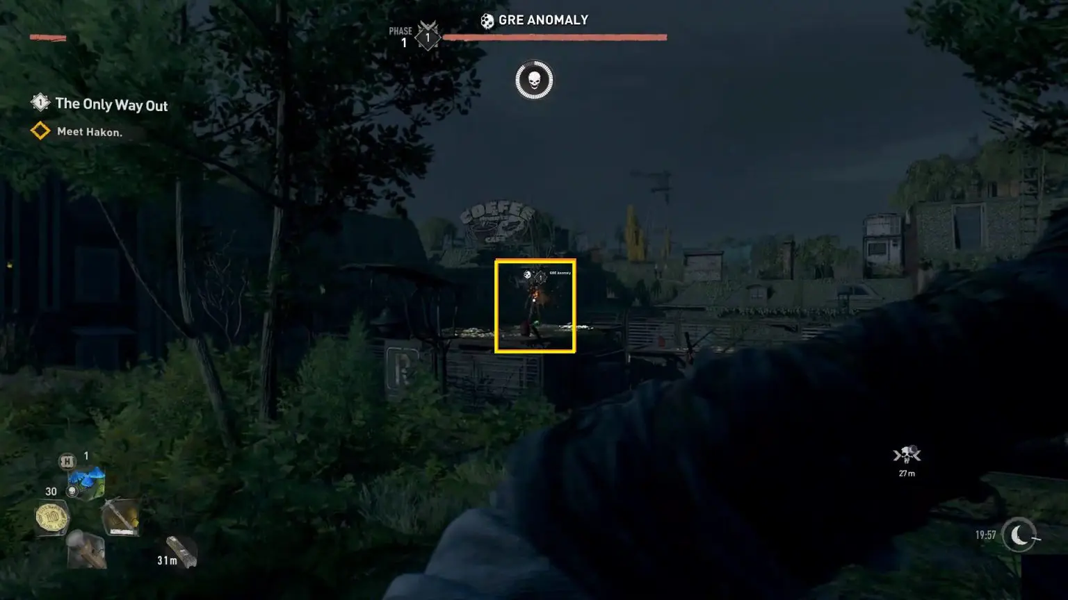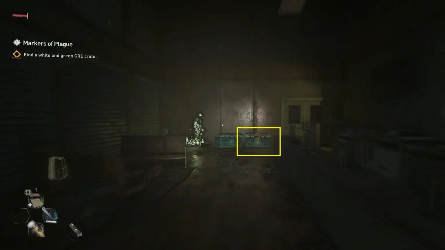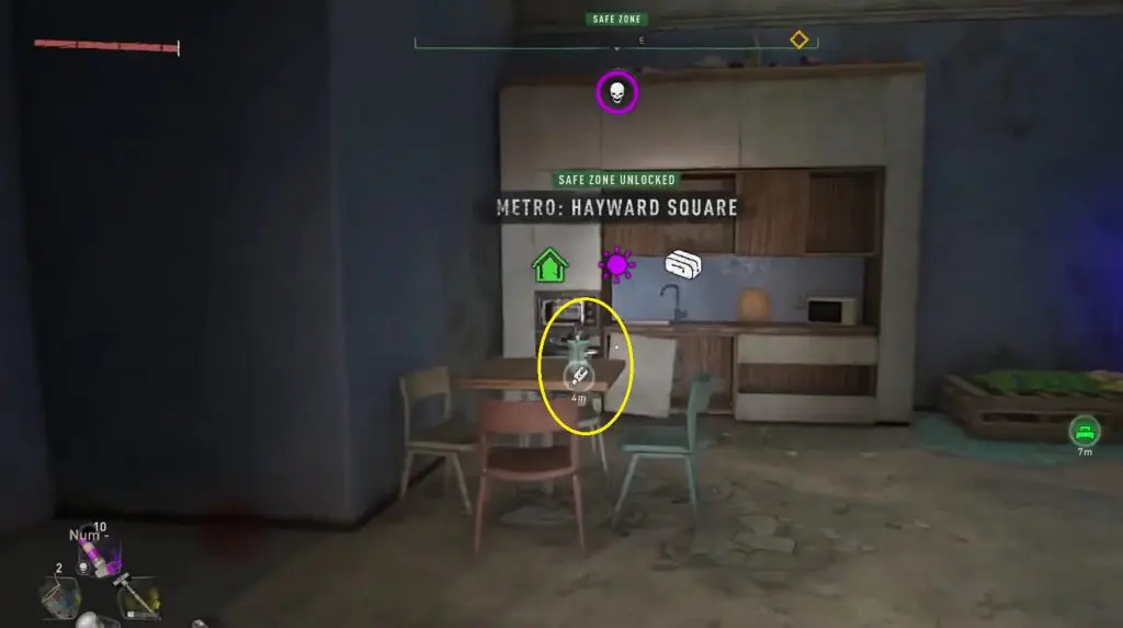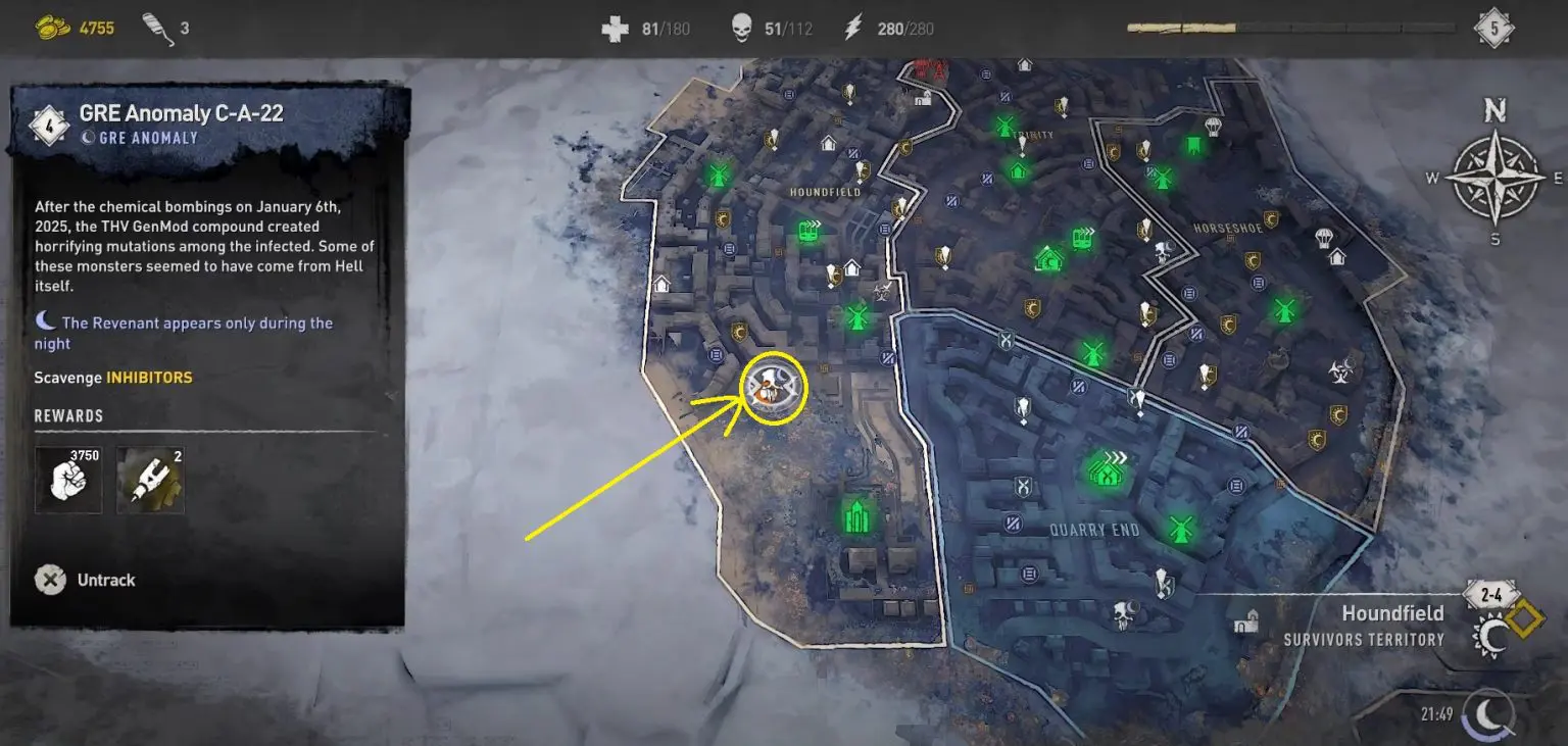 This is located north of Houndfield Electric Station in Houndfield district. GRE Anomalies only appear at night, you can go to a camp with a bed and set the time to night time. After defeating the GRE Monster, you will notice an orange-colored objective marker in the area leading to a trailer’s rooftop. Open the hatch and drop down to find a chest with 2 Inhibitors.