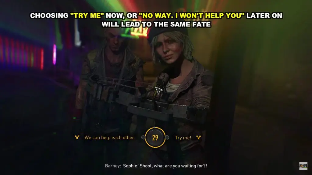 You’ll have two options at this point: “We can help each other” or “Try me.” At the end of the day, both options result in the same outcome, so this decision is meaningless. However, once you arrive and take control of the tower, you can choose whether to give the Peacekeepers or Survivors control of the water.