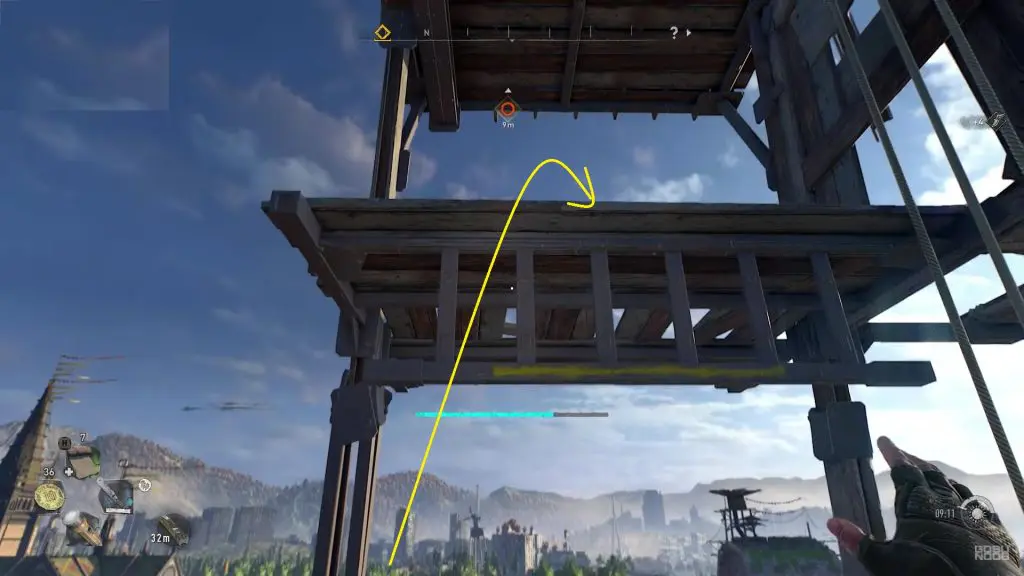 Starting from the bottom of the structure, climb the boards on the side as shown below.