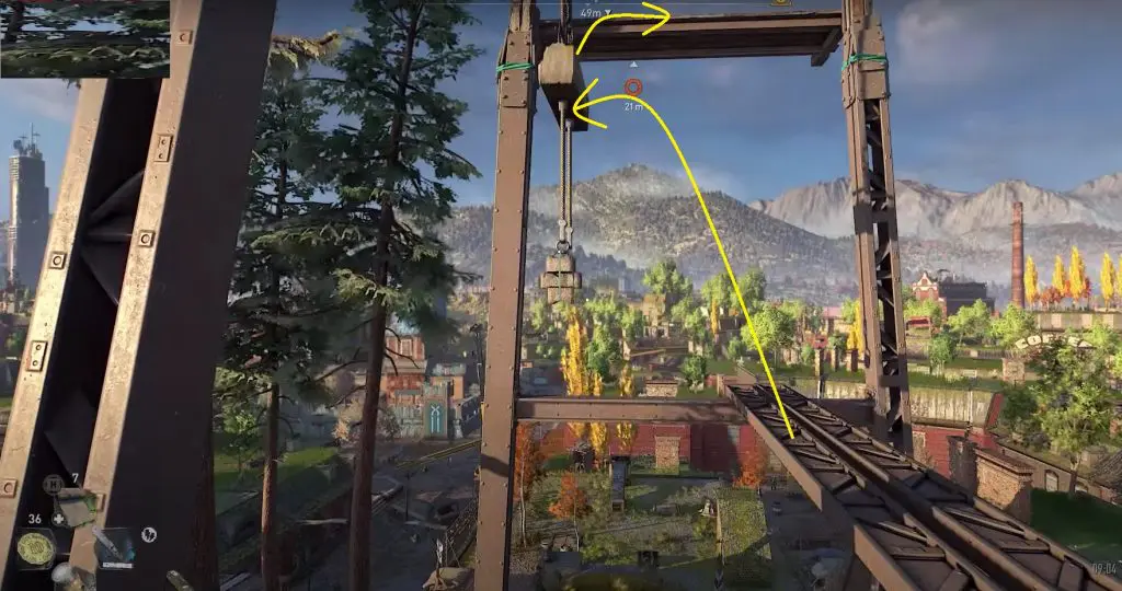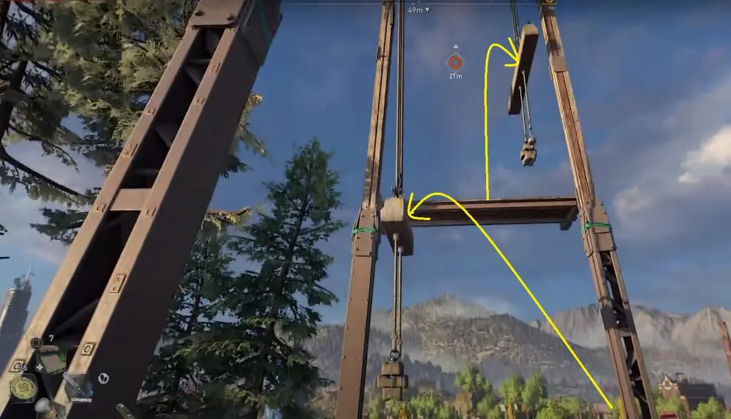 While standing or hanging on the moving weight, turn right. Jump and grab the wooden platform as the moving weight reaches the top.