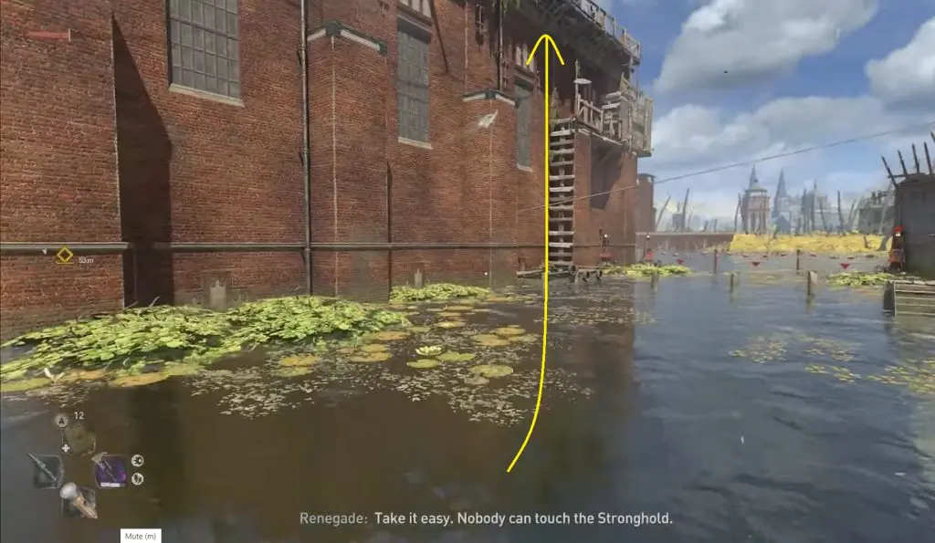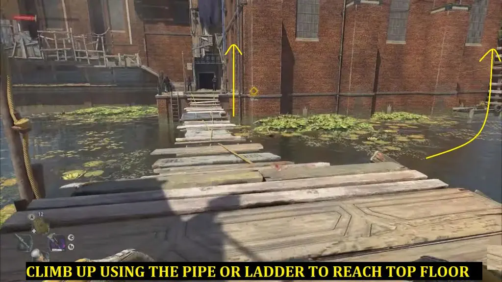 You must now ascend to the top floor of the main building. There are two ways to climb here: either jump into the water on the right side and then climb up the ladder or cross the wooden bridge and then climb using the blue pipe.