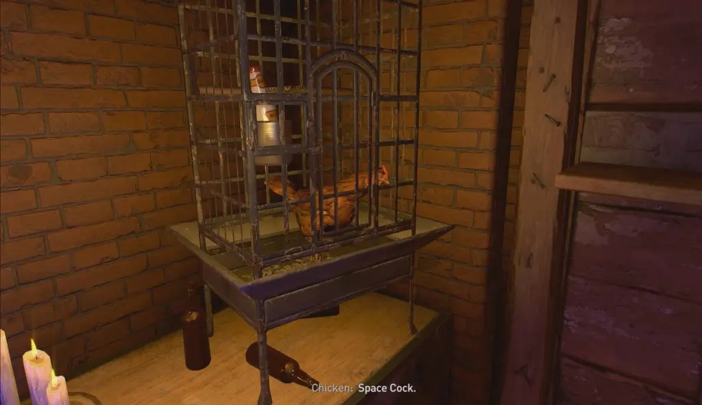 To find the caged chicken, go behind the orange tent. Interact with the chicken. This chicken will then explain that they are from space and have become stranded on the earth and that the only way they can return home is if you find a spaceship part for them, which they will mark on the map for you. This will trigger the Space Cock side quest.