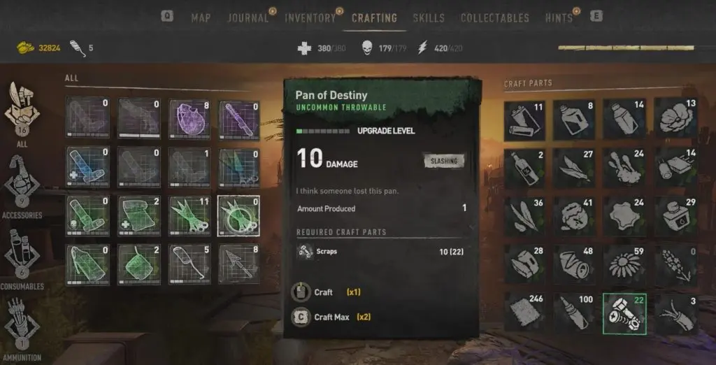 To make the pan, go to your crafting tab and use 10 scraps to make this one-of-a-kind weapon.