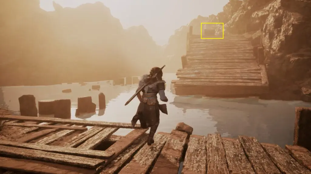 At the start of the chapter, dash across the submerged broken bridge. Check the right side, and you’ll find a chest on top of the wooden ramp.