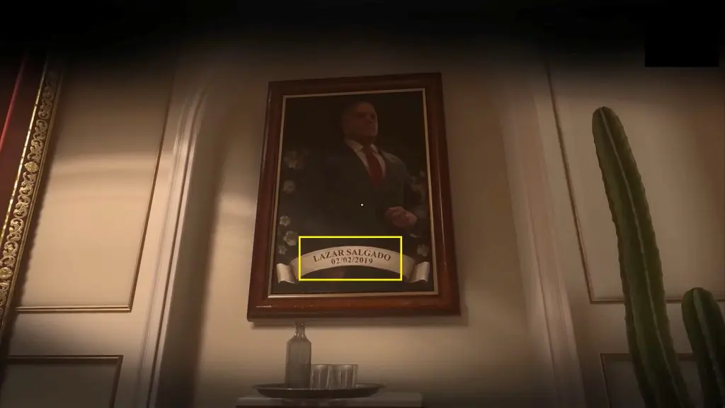 Inside Diego’s room, open the wardrobe as shown in the picture below to find the safe. The safe code is Lazar Salgado’s birthday, which is written on his painting as shown in the pictures below. Input the code 02-02-19 to open the safe and get a SHotgun and some Armor.
