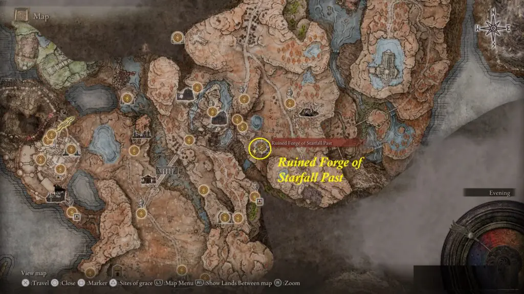 To start, proceed to the Ruined Forge of Starfall Past Site of Grace as marked on the map.