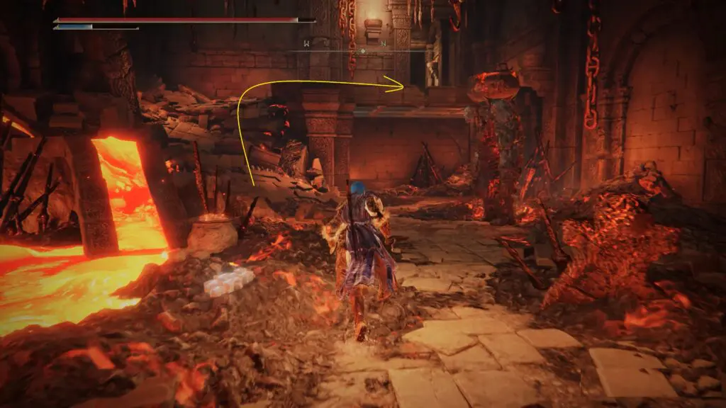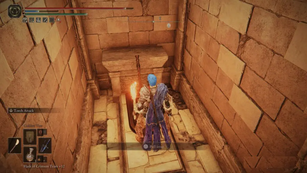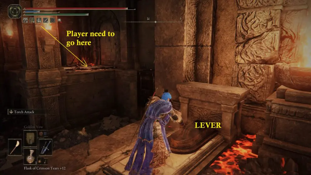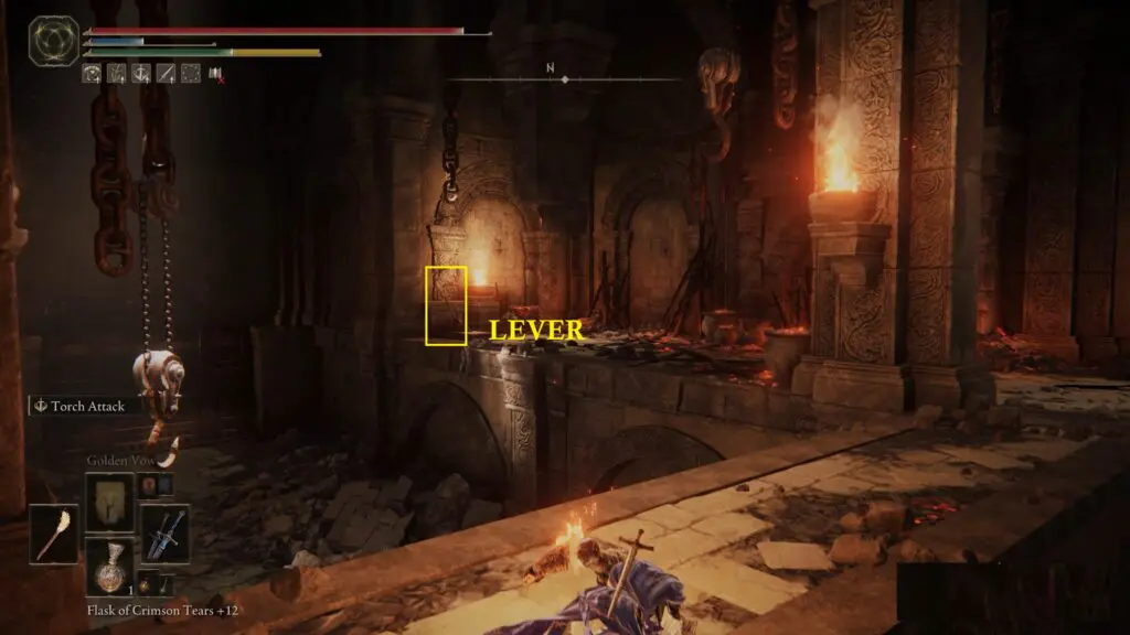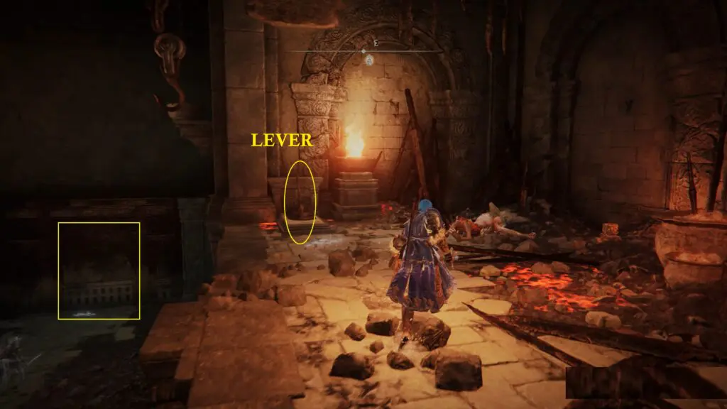 Activate the lever next to the brazier to unlock the door and continue forward.