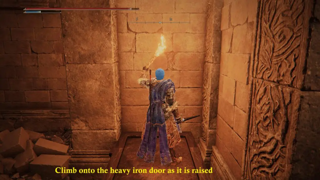 Behind the door, and pull another lever to raise the heavy door. Once the door is raised, climb onto it and jump onto the platform on the left side of the room.