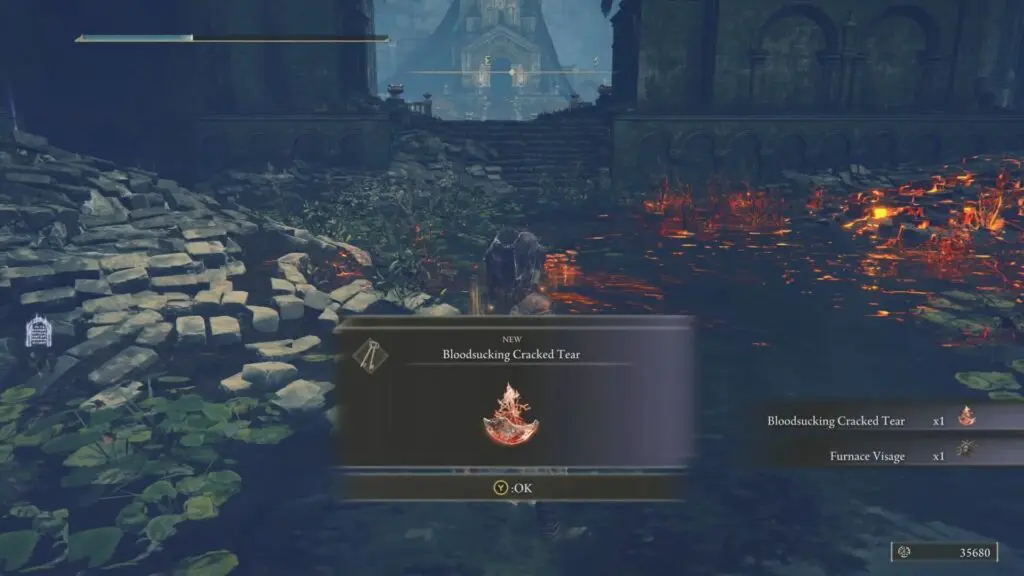 To get Bloodsucking Cracked Tear, players must visit the Ruins of Unte, and defeat the Furnace Golem by lighting its furnace head with a Hefty Furnace Pot. This will cause the creature to drop the Bloodsucking Cracked Tear. Follow the below steps to get Bloodsucking Cracked Tear.
