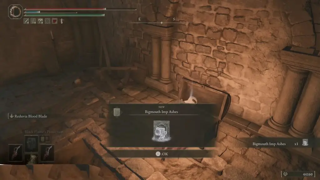 Jump down onto the ledge behind the giant cannon-head Imp. Proceed into the room on the south side to find Bigmouth Imp Spirit Ashes.