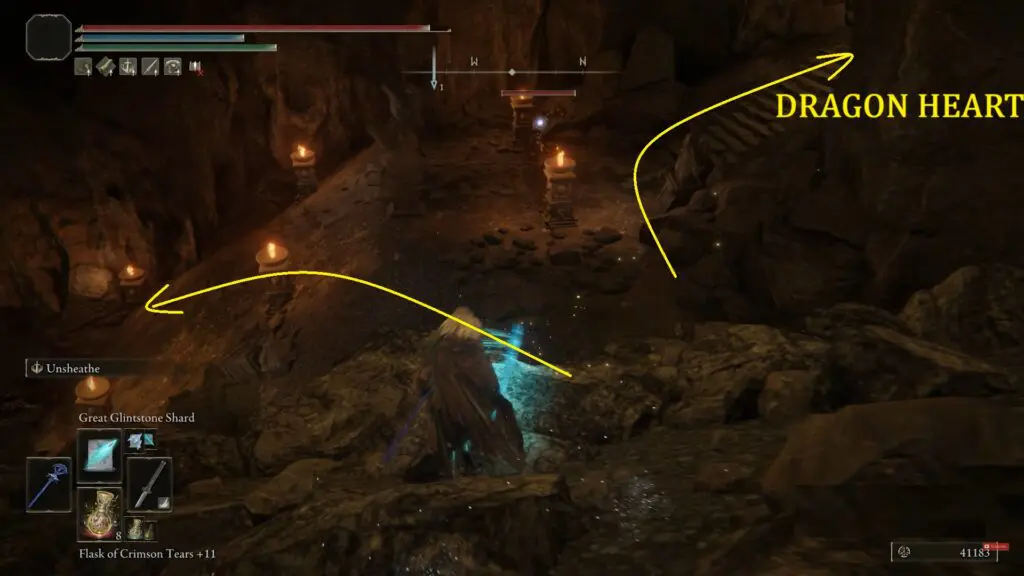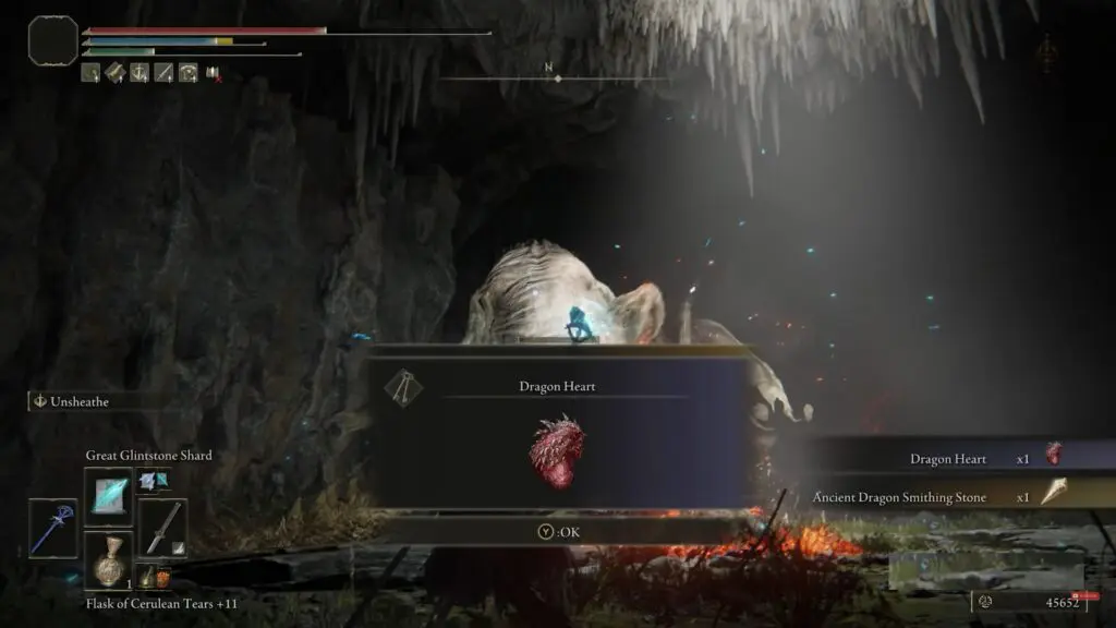Follow the candle to reach a larger area. Here defeat the giant dragon to receive Dragon Heart + Ancient Dragon Smithing Stone.