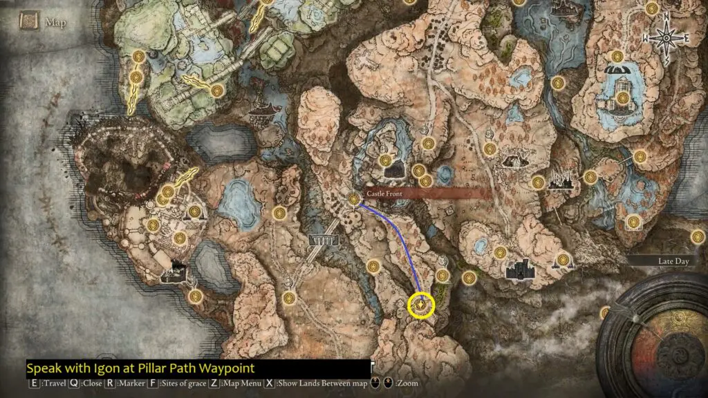 Players can start heading south from the Castle Front Site of Grace to reach the Pillar Path Waypoint Site of Grace. Speak with NPC Igon, located just west of the Site of Grace. It is the first location for this NPC.