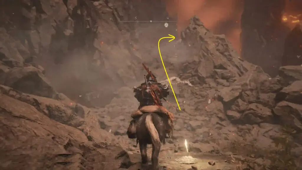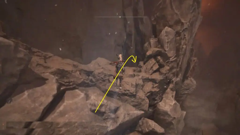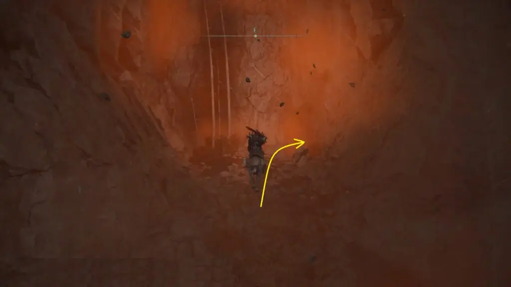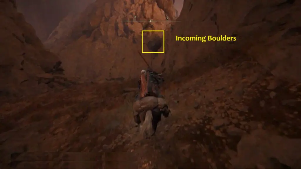 Proceed east and southeast along the path, being cautious of two rock boulders that may crash down toward you.