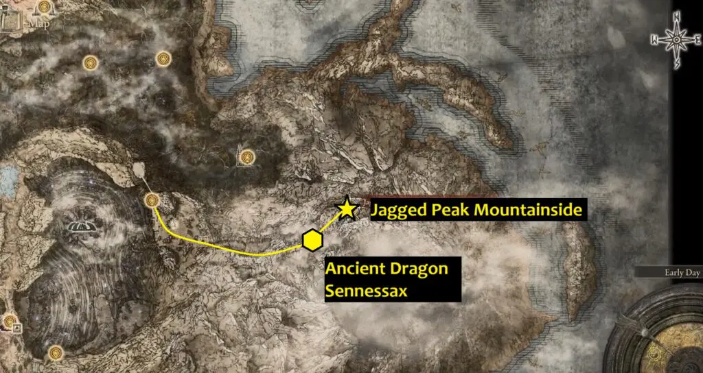After defeating Ancient Dragon Sennessax, a player should head northeast (along the left wall) to reach the Jagged Peak Mountainside Site of Grace.