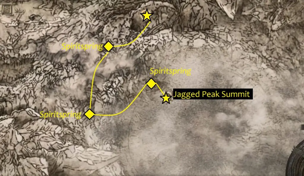From the Site of Grace, head southwest up the rocks until you reach a Spiritspring near dragon carcasses. Refer to the below map.