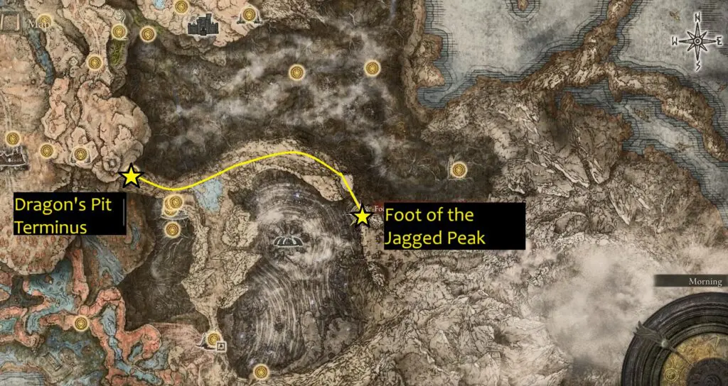 Now retrace your steps back to Dragon’s Pit Terminus. Then follow the path east to reach the Foot of the Jagged Peak Site of Grace.
