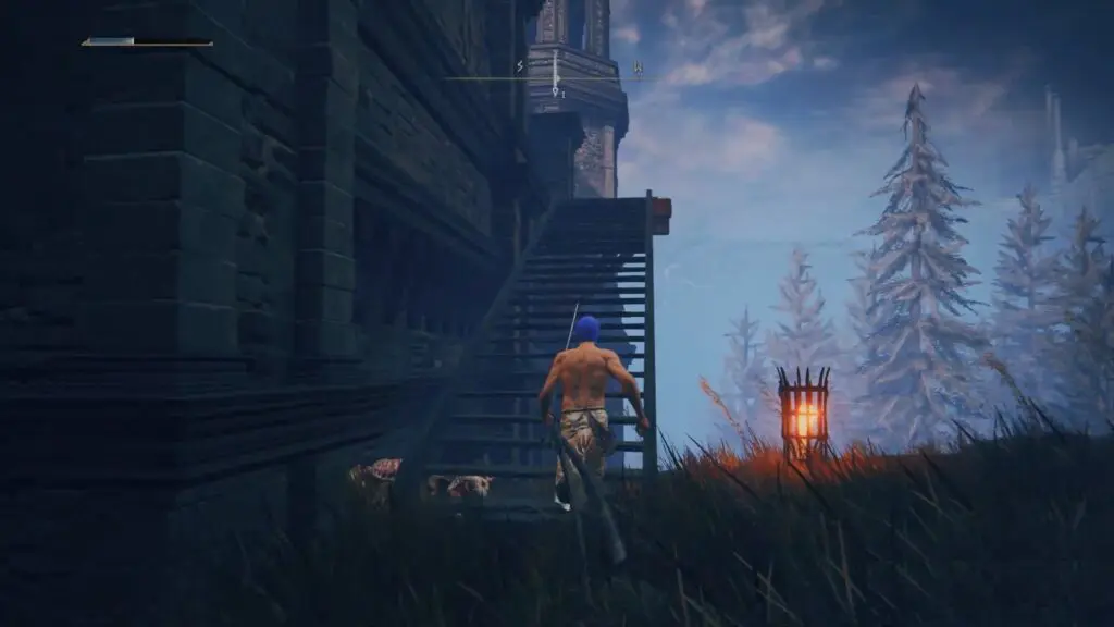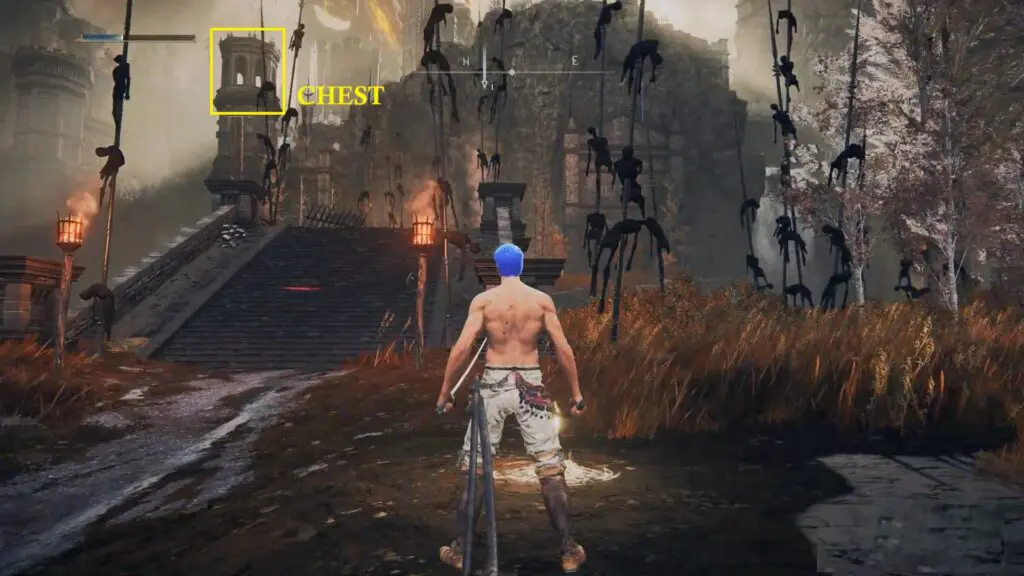 Go up the stairs and defeat any enemies you encounter. Climb the ladder all the way to the top of the tower to find a chest.