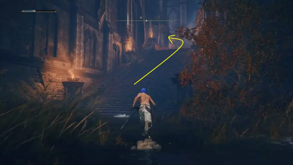 Go up the stairs and take the left path. You will find wooden stairs on the rear side of the building near the cliffside.