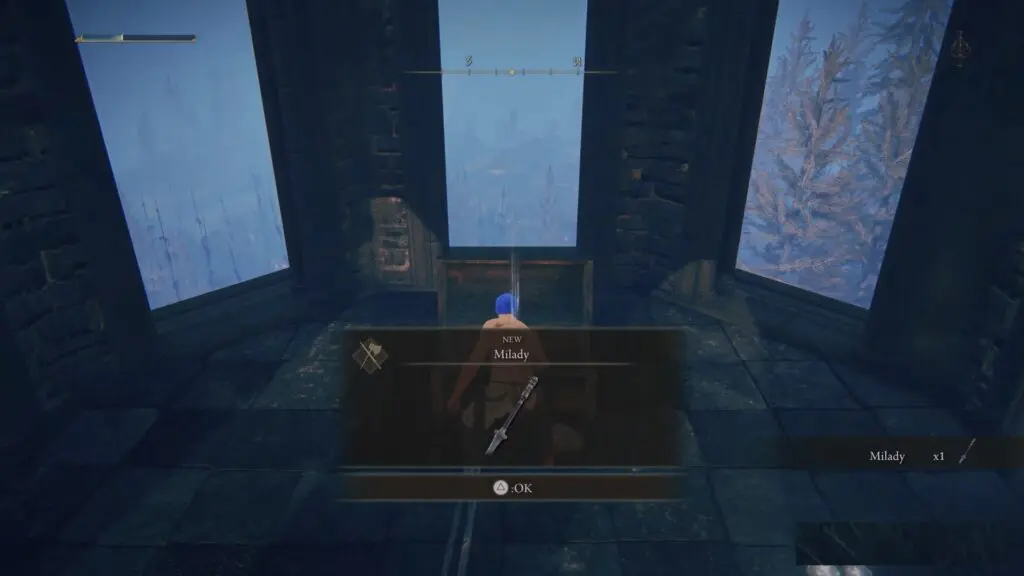 You can find Milady early on in your adventure in one of the castle’s towers in Castle Ensis. After crossing the bridge, continue down the main path.