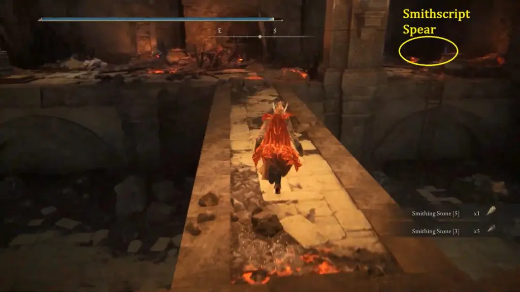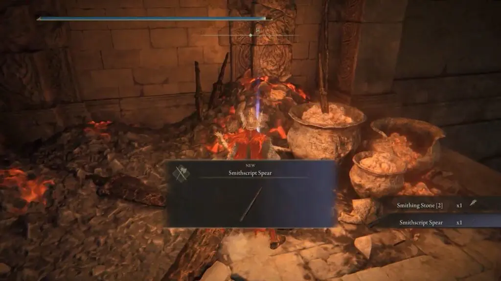 Cross to the other side of the room from the elevated platform, then head to the right to find a Smithscript Spear on another corpse.