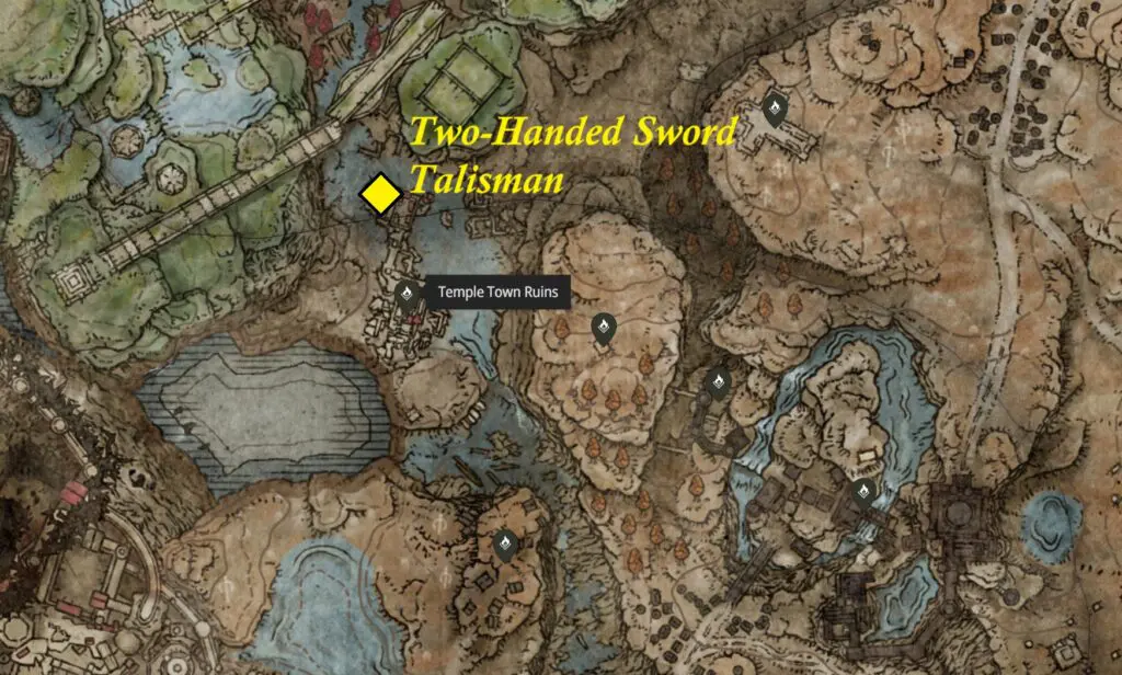 You can find the Two-Handed Sword Talisman in the Temple Town Ruins. It is located inside the highest structure.